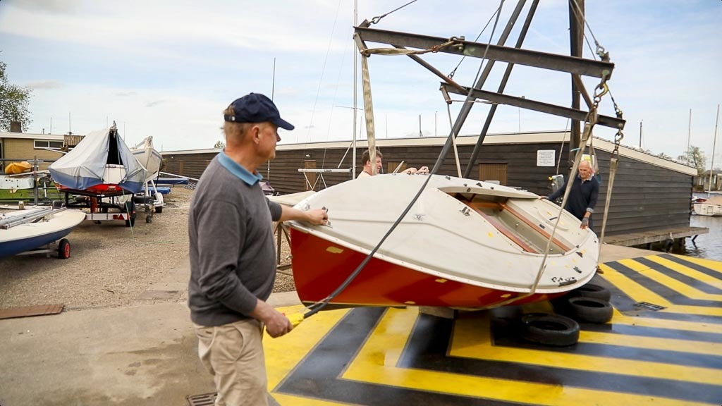Door middel van 2 haken en 2 stroppen die aan de kuiprand worden bevestigd kunnen we de Randmeer veilig en vrij eenvoudig op de kop leggen.