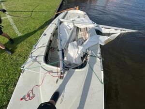 Deze wedstrijd begon voor Gijs Andringa en zijn bemanningsleden Peter en Sebas wel heel opmerkelijk: toen ze zich aan het klaarmaken waren voor hun start voer 7 minuten vóór de start plotseling een Regenboog bij hen naar binnen. 1054 over bb, Regenboog over sb. Mast overboord, hoop gedoe, voor de 1054 viel de wedstrijd in het water. Reuze jammer, deze Sneekweek was voor de heren de eerste van hun carrière als wedstrijdzeilers. Gelukkig kon de boot direct terecht bij de Jachtwerf Heeg, en als het goed is de boot dinsdag weer op orde en kunnen ze weer meedoen. Waarschijnlijk krijgen ze door dit akkefietje buiten hun schuld om wel wat bonus/startpunten.