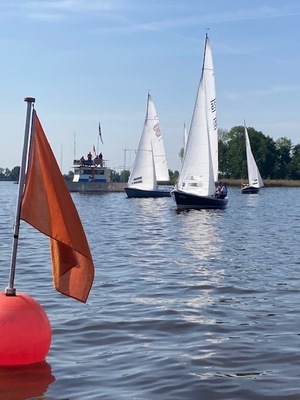 Na het palaver voeren de 14 boten richting de wedstrijdbaan te varen. Om 09:55 uur klonk het eerste waarschuwingssignaal voor de eerste start. Wij, de 1115, zaten bij de eerste start in de 3e shift dus konden we de kunst van het starten en de juiste startplek een beetje afkijken. Dit hielp helaas niet erg: we eindigden in de eerst pot op de vierde plek. Het was moeilijk zeilen, met veel winddraaiingen en -stiltes gedurende de wedstrijd. We konden gelijk door naar de tweede wedstrijd omdat we nu ingedeeld waren in shift 1. Na een slechte start gingen we gelijk na de start overstag, wat een juiste keus bleek: we bereikten als tweede de bovenboei en konden deze plek verzilveren op de finish. In twee races daaropvolgend was het lastig varen. De wind nam toe en af en had als vanzelfsprekend wisselende richtingen. Hulde voor het wedstrijdcomité die met man en macht de wedstrijdbaan er zo goed en zo kwaad als mogelijk in kon leggen.